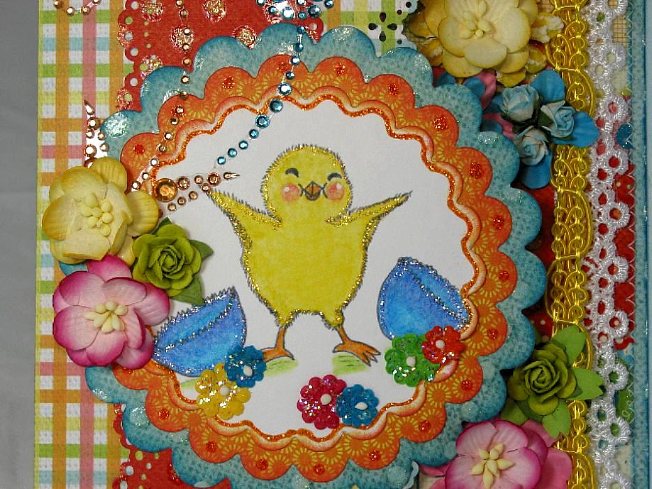 Oh Sweet Bons! Look at all this BLINGITY BLING BLING!! I love it!! Your chicky-poo looks so happy to be poppin' out of it's shell to be on your card! This is absolutely BEAUTIFUL Bons!!! All these wonderful embellishments, and sooo much detail to this! Amazing work my dear friend! Thank you for inspiring me! And those colors! Sooo lively and vivid! Gorgeous!